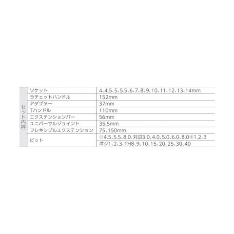 ●ソケット内容(mm):4、4.5、5、5.5、6、7、8、9、10、11、12、13、14