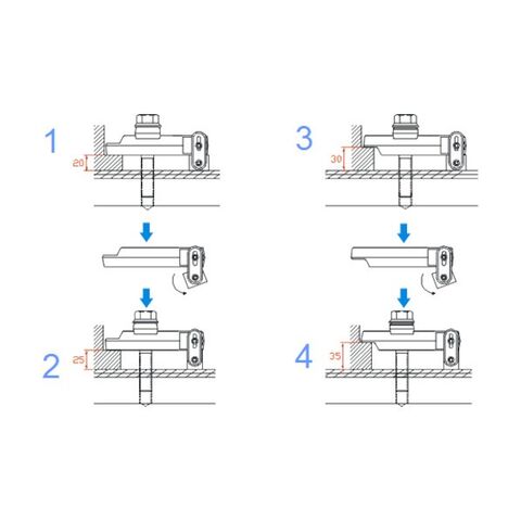 ●1つのボルトで4種類の金型モールドベース厚み(20、25、30、35mm)に対応します。