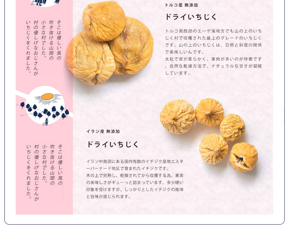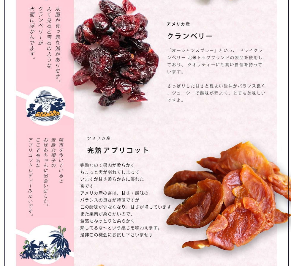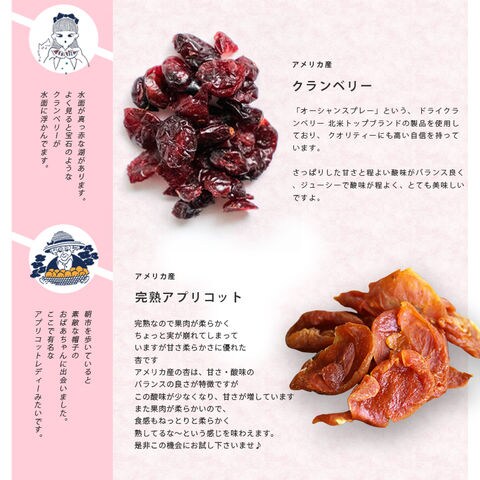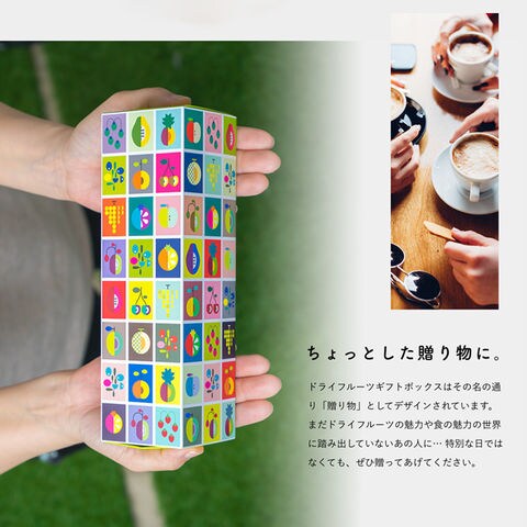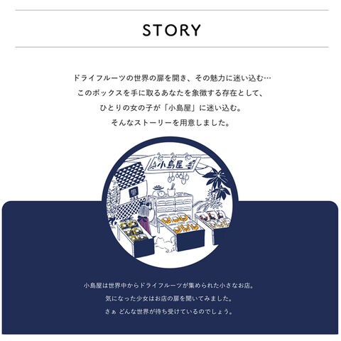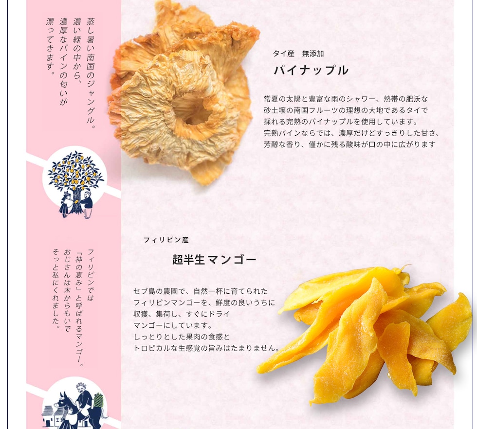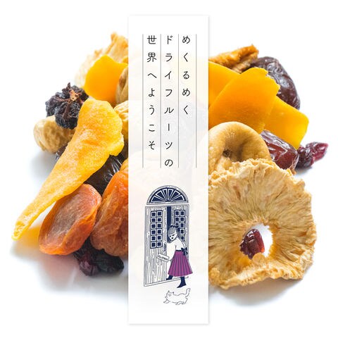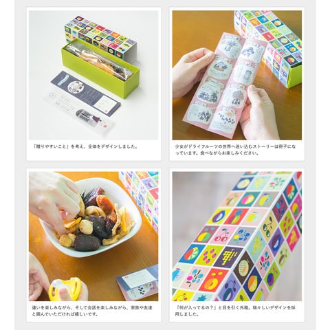 あなたは旅するように、「へーこれはこんな所からなんだ。」「こんな味の食べ物があるんだ。」と付属のストーリーブックを読みながら、ドライフルーツをお楽しみいただければと思います。