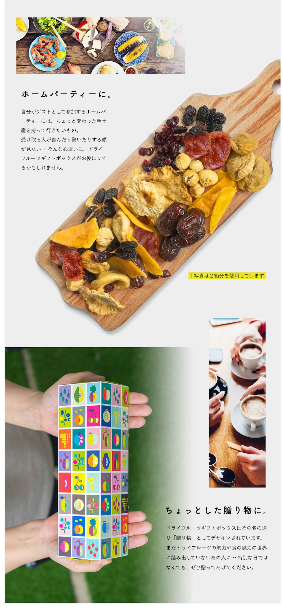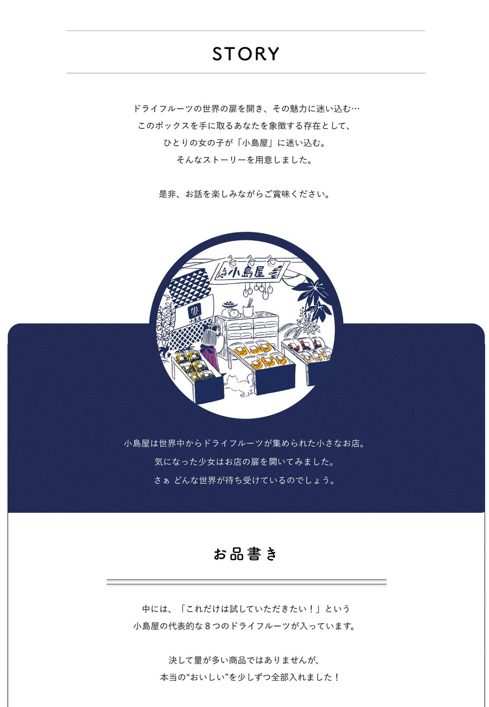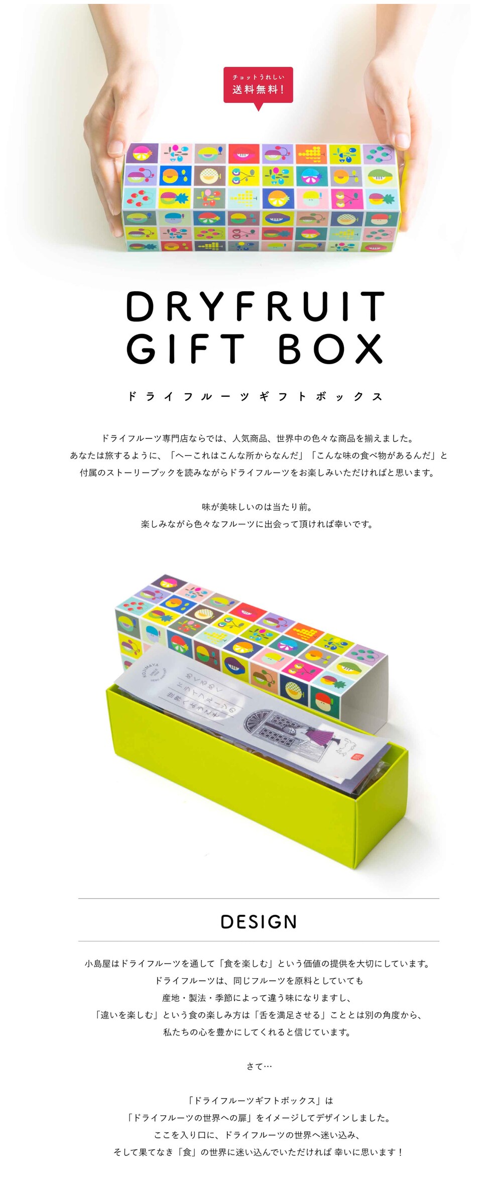 あなたは旅するように、「へーこれはこんな所からなんだ。」「こんな味の食べ物があるんだ。」と付属のストーリーブックを読みながら、ドライフルーツをお楽しみいただければと思います。