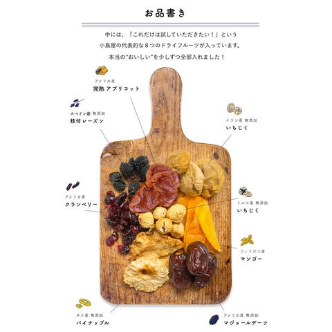 8種類のドライフルーツが入っていますので、 1種類ずつ、楽しみながらお召し上がり頂ければ幸いです♪