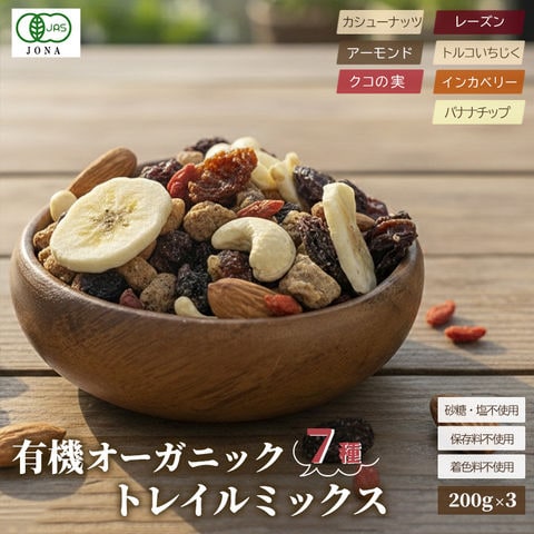ナッツ 専門店 オリジナル 有機 オーガニック 7種トレイルミックス 200g ×3個 JAS 有機認証 ミックスクスナッツ ドライフルーツミックス レーズン いちじく カシューナッツ インカベリー アーモンド バナナチップ 山登り スポーツ 上野 アメ横 dryfruits nuts