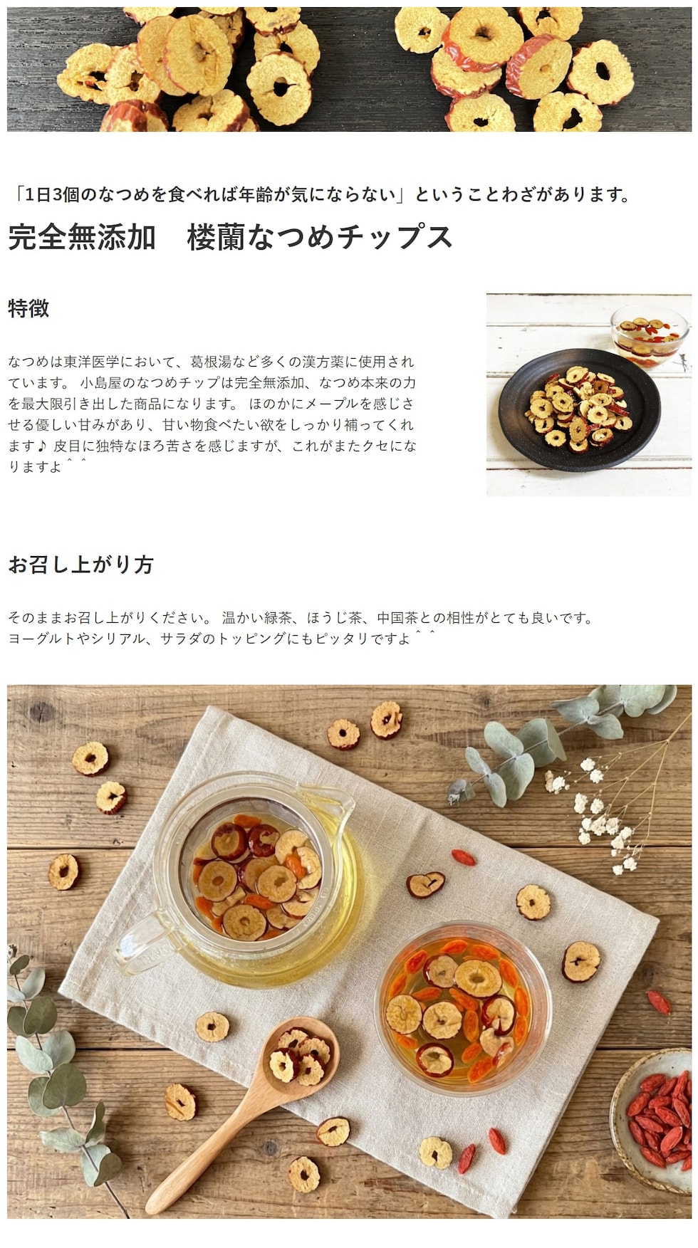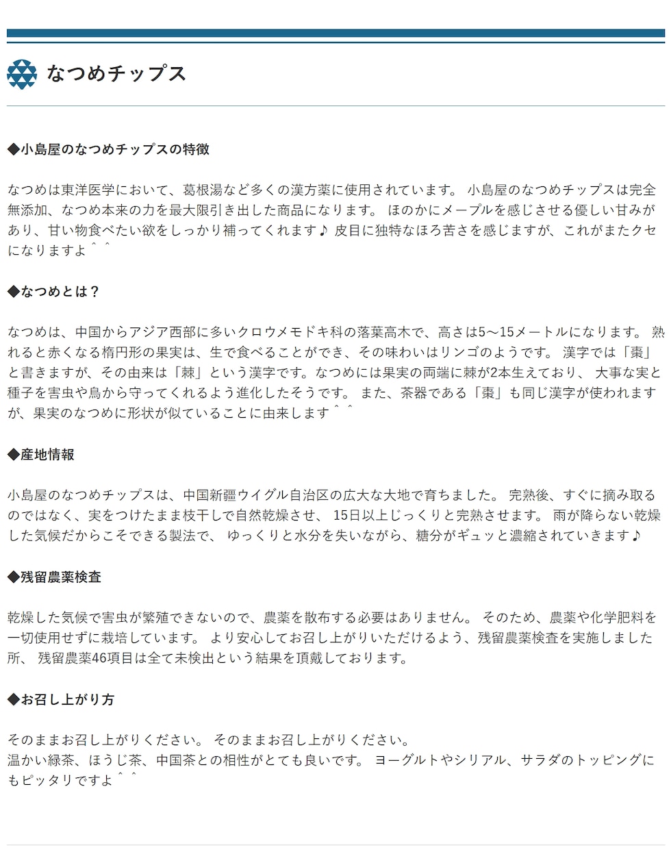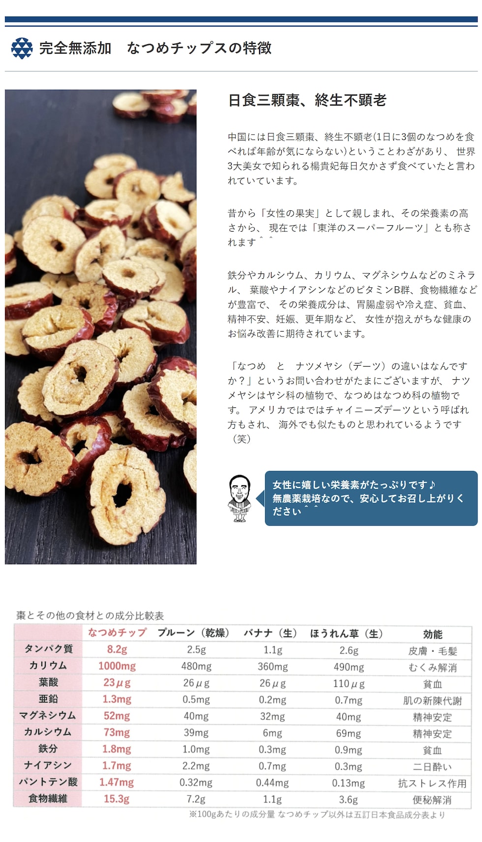 小島屋のなつめチップは完全無添加、なつめ本来の力を最大限引き出した商品になります。