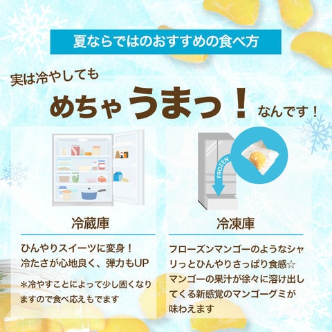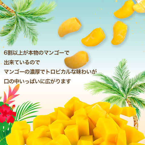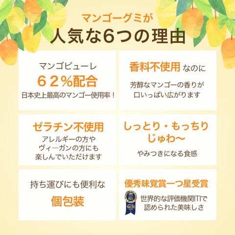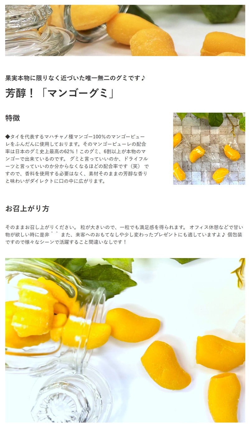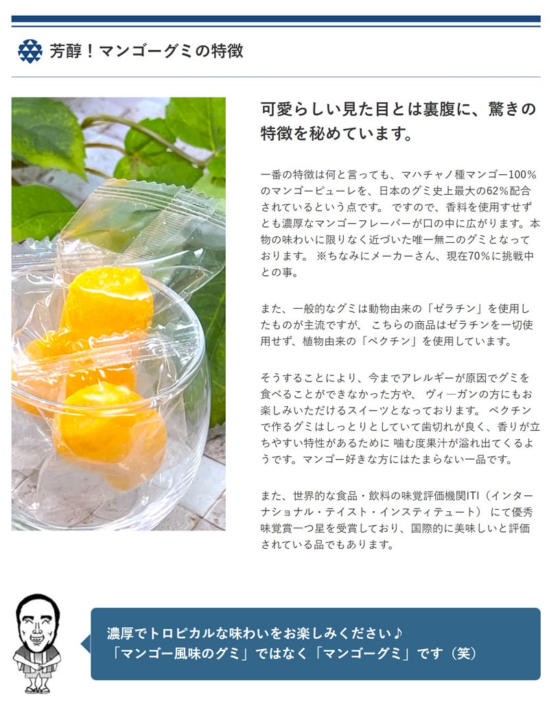 原材料の6割以上を本物のマンゴーが締めていますので、 噛んだとたん濃厚でトロピカルなマンゴーの風味が口の中に広がります♪ 弾力があると言うより、歯切れが良いタイプのグミですので、香りが立ちやすく、 噛む度果汁が溢れ出てくるようです。)