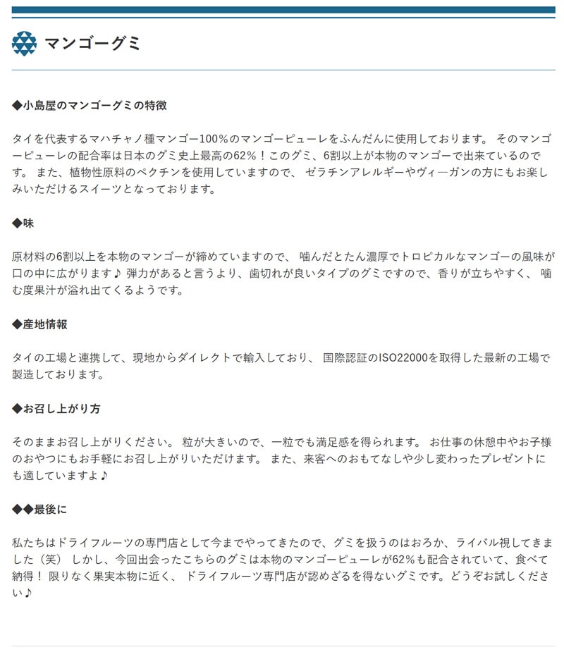 しかし、今回出会ったこちらのグミは本物のマンゴーピューレが62%も配合されていて、食べて納得! 限りなく果実本物に近く、 ドライフルーツ専門店が認めざるを得ないグミです。
