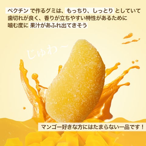 そうすることにより、今までアレルギーが原因でグミを食べることができなかった方や、 ヴィ―ガンの方にもお楽しみいただけるスイーツとなっております。 ペクチンで作るグミはしっとりとしていて歯切れが良く、香りが立ちやすい特性があるために 噛む度果汁が溢れ出てくるようです。マンゴー好きな方にはたまらない一品です。