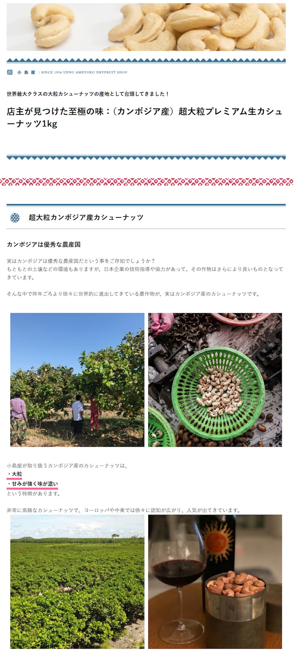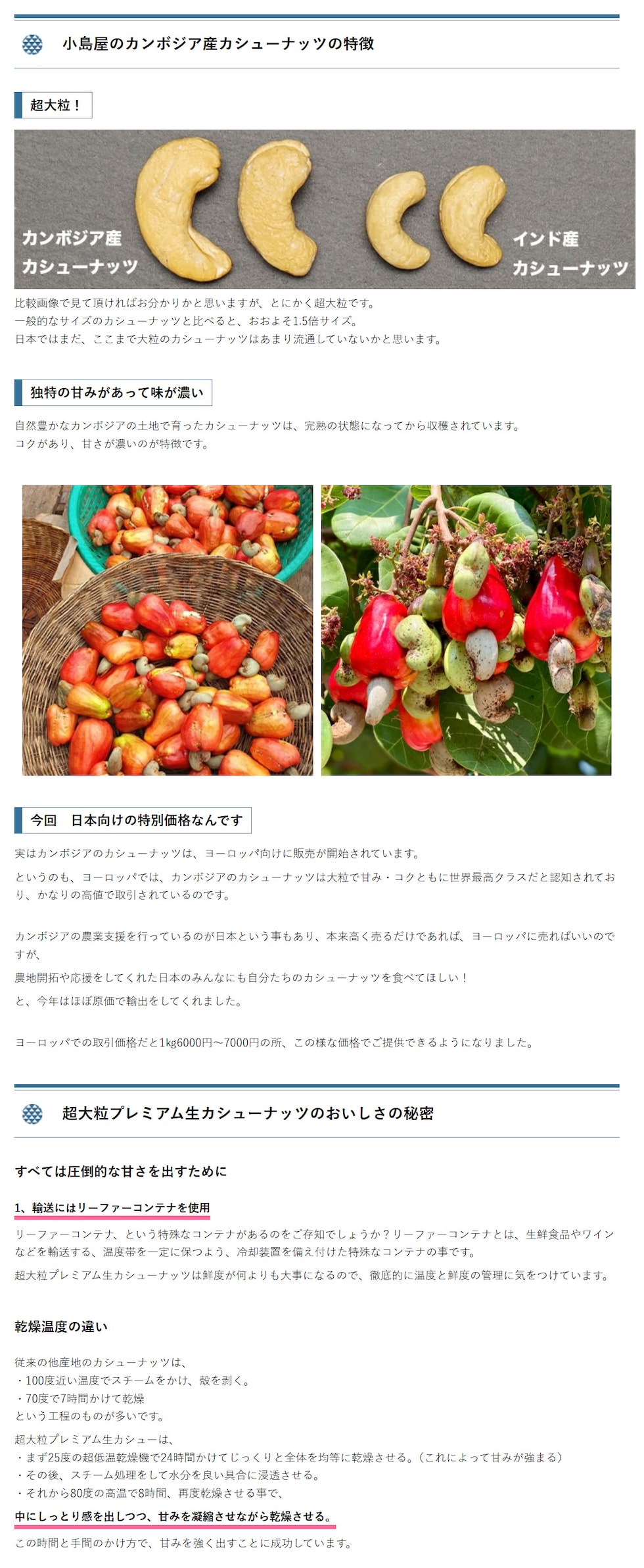 ◆小島屋の素焼き無添加カンボジア産カシューナッツの特徴