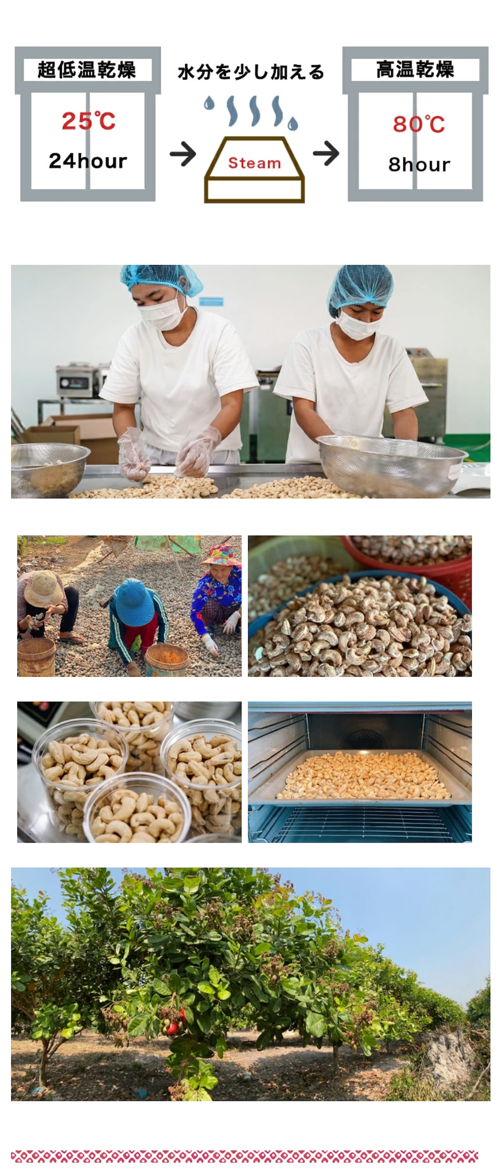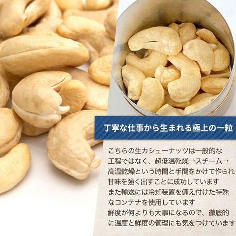 おいしさの秘密である手作業部分は工業化せず、カンボジアの女性を中心にして作られる大粒カシューナッツ。 少量ずつを丁寧に作り、品質管理や衛生面は日本基準の工場で作られています。