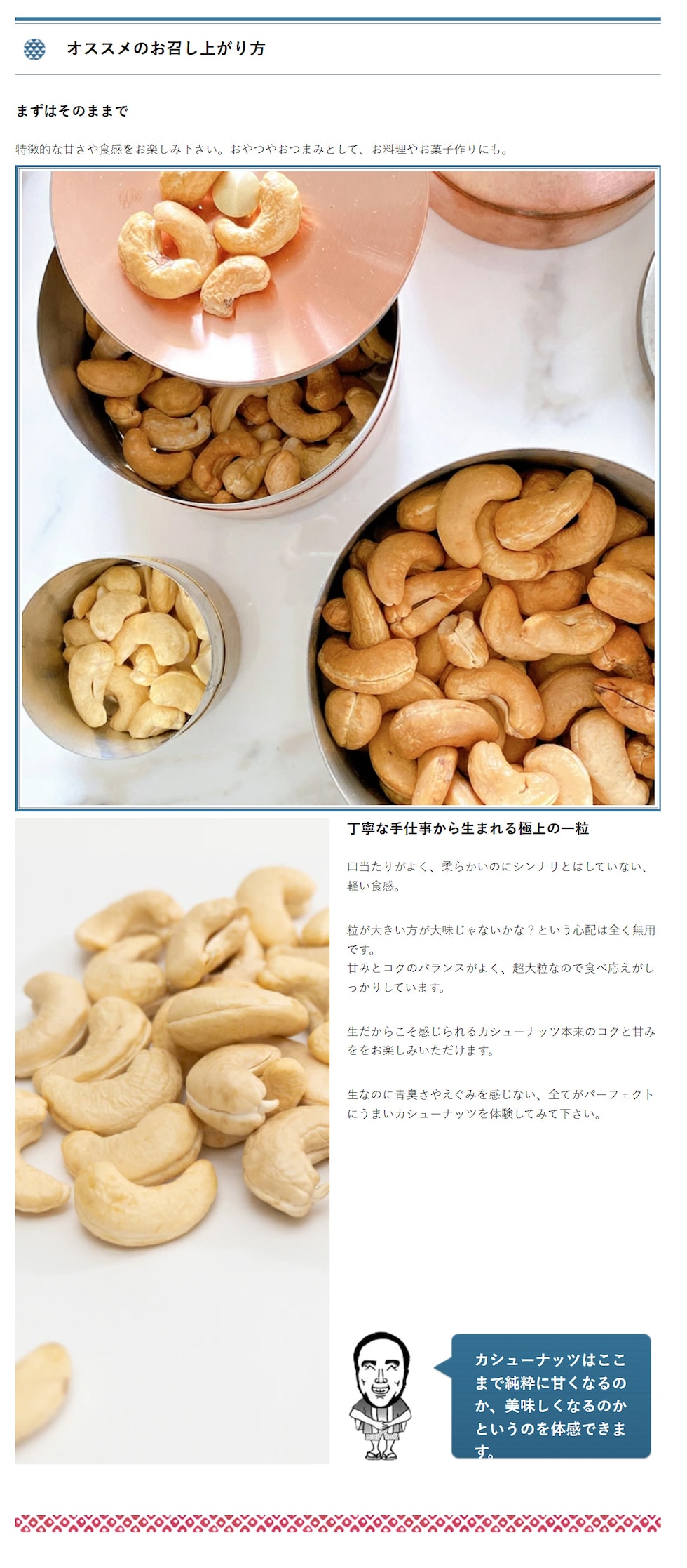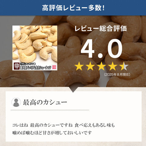 「大きいから大味じゃない?」という心配は無用で、カシューナッツの良いところである甘みとコクのバランスがよく、超大粒なので食べ応えがしっかりしています。