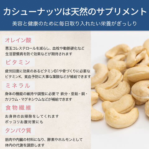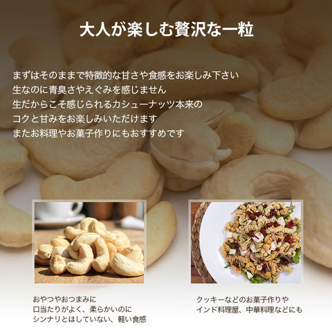 おやつとして、おつまみとして、味がついていない生カシューですのでお菓子作りやお料理にもお使い頂けます。