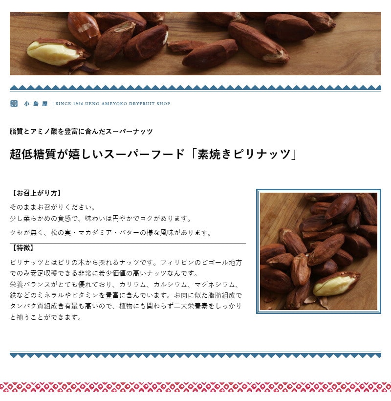 大量生産が難しいナッツで、その分お値段も少し高くなっておりますが、 小島屋では直輸入にて、