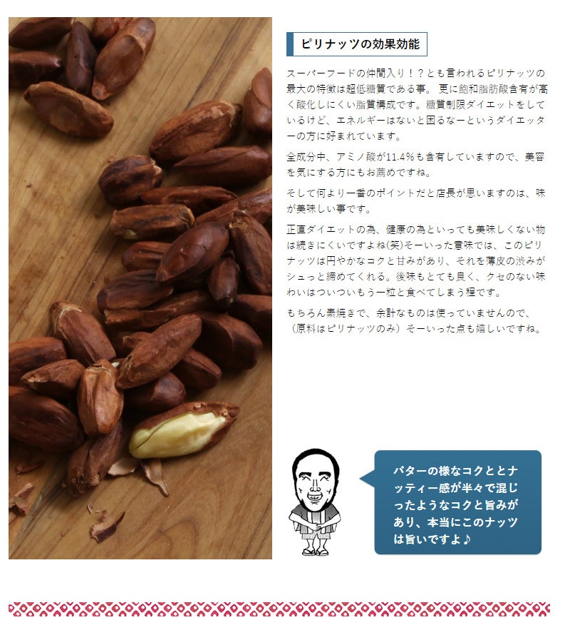 小島屋では、商社さんから直輸入にて厳選したフィリピン産のピリナッツを仕入れ、素焼きローストしております。