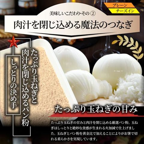 | ◇原材料 | 【プレーン】鶏肉(国産)、粒状植物性たん白、たまねぎ、パン粉、牛脂、しょうゆ、砂糖、食塩、赤ワイン、香辛料、植物油脂/調味料(アミノ酸等)、リン酸塩(Na)、カラメル色素、(一部に小麦・乳成分・卵・牛肉・鶏肉・大豆を含む) 【チーズイン】鶏肉(国産)、乳等を主要原料とする食品(小麦粉、動物油脂、砂糖、人参、トマトペースト、食塩、ソテーオニオン、醸造酢、たん白加水分解物、香辛料、オニオンパウダー、畜肉エキス/カラメル色素、調味料(アミノ酸等)、増粘剤(加工デンプン)、香料、酸味料、(一部に小麦・大豆・鶏肉・豚肉を含む) |