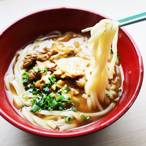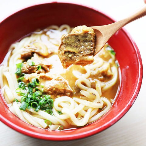 【オリーブ牛入りカレー(100gあたり)】 熱量138kcal、たんぱく質12.8g、脂質5.1g、炭水化物11.4g、食塩相当量1.2g 【うどん+つゆ(1食:うどん110g+つゆ20mlあたり)】 熱量332kcal、たんぱく質7.9g、脂質1.1g、炭水化物72.8g、食塩相当量8.1g |