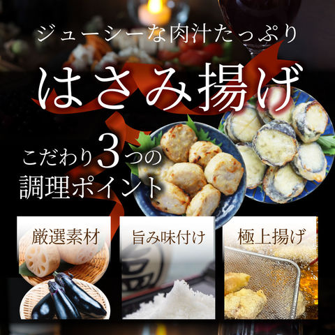 栄養成分表示(100gあたり) ●ナスはさみ揚げ:熱量163kcal たんぱく質6.3g 脂質8.5g 炭水化物15.4g 食塩相当量0.9g(この表示値は目安です)