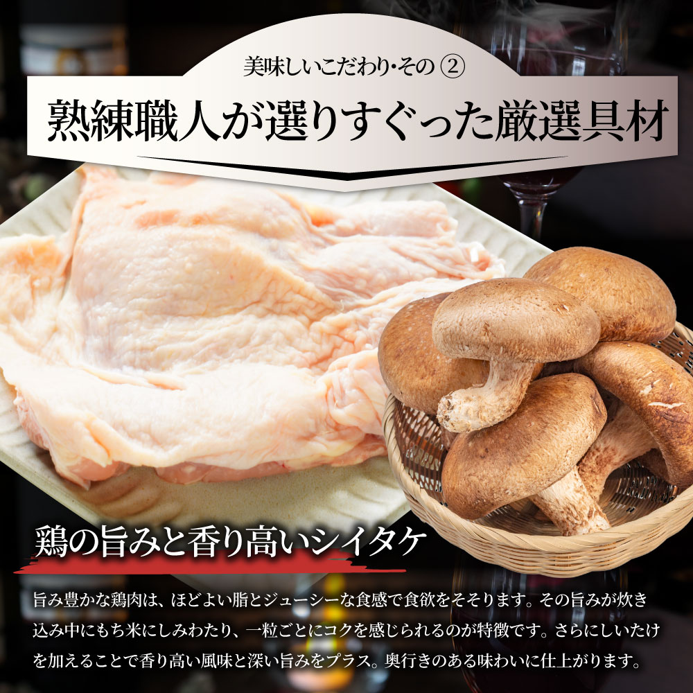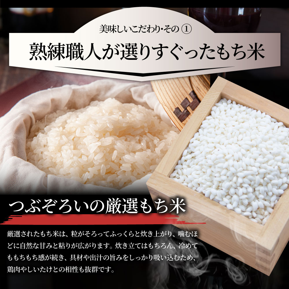 原材料 もち米(中国産)、鶏肉、シイタケ、砂糖、しょう油、植物油脂、みりん、カツオ風味調味料・調味料(アミノ酸等)、(一部に小麦・大豆・鶏肉を含む)