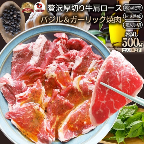 オーストラリア産 牛肩ロース バジル&ガーリック 焼肉 500g(250g×2)赤身 贅沢 タレ漬け オージー 牛肉 焼くだけ バジル ガーリック レジャー BBQ 爆買