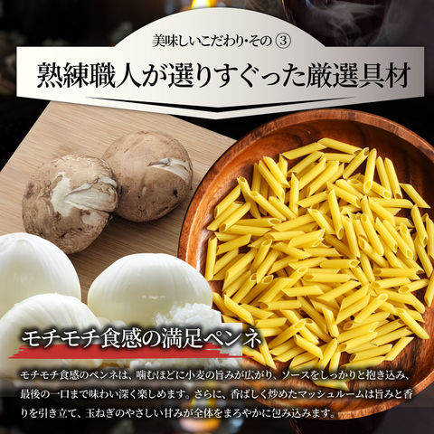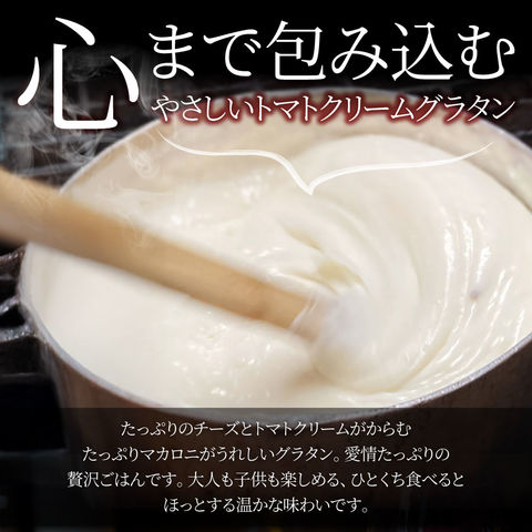 原材料 マカロニ(イタリア製造)、牛乳、脱脂濃縮乳、チーズ、バタールウ(小麦粉、バター)、乳等を主要原料とする食品(植物油脂、デキストリン、脱脂粉乳、その他)、たまねぎ、植物油脂、生クリーム、小麦粉、マッシュルーム、魚介エキス、トマトペースト、アメリケーヌソース、食塩、砂糖、むきえび、ワイン、えびエキス、チキンブイヨン、かにエキス、野菜ブイヨン、パン粉、ガーリックペースト(にんにく、食塩)、香味油、香辛料、酵母エキス、ぶどう糖、調味エキス/増粘剤(加工デンプン、キサンタンガム)、調味料(アミノ酸等)、乳化剤、香料、着色料(カラメル、トマト色素)、酸味料、(一部にえび・かに・小麦・乳成分・大豆・鶏肉・豚肉・ゼラチン・魚醤パウダー(魚介類)を含む)