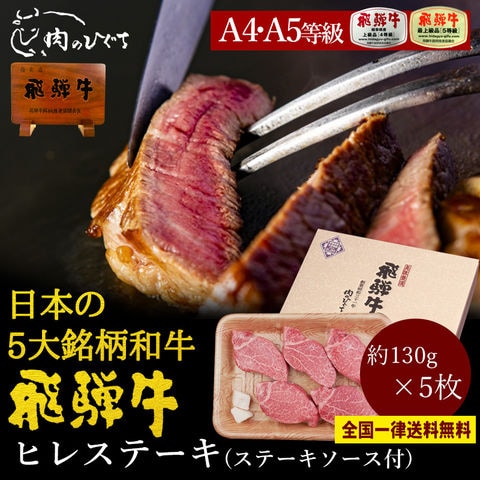 【12/31まで出荷可】【A4-A5等級 飛騨牛 ヒレ ステーキ 希少部位 5枚 化粧箱入 ソース付 全国一律送料無料】約130g×5枚 肉 ギフト 精肉 精肉ギフト 内祝 御礼 ブランド和牛 お歳暮 御歳暮 ぽっきり