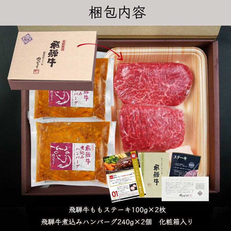 飛騨牛ももステーキ100g×2枚+飛騨牛100%煮込みハンバーグ×2個 化粧箱入り いつもありがとう 日頃の感謝の贈り物に <br> お歳暮 御歳暮 肉 ギフト 赤身 ステーキ マツコの知らない世界で紹介 プレゼント