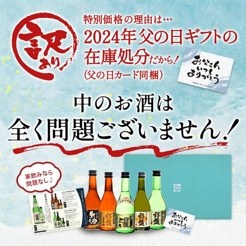 | 【商品名】 [訳あり] 銀盤酒造 全て純米大吟醸 生貯蔵&原酒入り 300ml×5本 【商品紹介】 数量限定!もちろん送料無料! 昨年の父の日ギフトとしてご好評いただいた『銀盤酒造 全て純米大吟醸 生貯蔵&原酒入り 300ml×5本』飲み比べセットを父の日カード入りでご用意していた在庫が、一部残ってしまった為この度、「訳あり品」として特別価格にてご提供いたします。 ・温度管理された倉庫で保管されています。 ・日本酒詰め日:2024年5月 ※外装に若干の擦れ・折れが見られる場合があります。あらかじめご了承ください。 ■こんな方にもおすすめ ・お家でゆっくりと日本酒を楽しみたい方 ・飲み比べしてお気に入りを見つけたい方 ・お得に純米大吟醸を楽しみたい方 ・おつまみとのペアリングを楽しみたい方 黒部の銘酒を生み出す「銀盤酒造」。今回はそんな銀盤酒造の純米大吟醸ばかりを集めた特別飲み比べセットです。 1911(明治44)年に始まった歴史ある清酒品評会で名誉ある金賞を通算20回受賞する実力蔵。 黒部川扇状地湧水群の水で醸し、米の違いはもちろん数多くの酒種を生み出し、富山県はもちろん全国にファンがいる銘蔵です。 今回は、ぜひそんな銀盤酒造を余すことなく飲み比べてほしい・・・当社の強い想いでこのセットは生まれました。 純米大吟醸の米の違いはもちろん、生貯蔵酒、原酒など様々なタイプのお酒をご用意しました。 長期低温貯蔵により、上品な香りとなめらかな喉越しが楽しめる絶品の純米大吟醸をぜひ心ゆくまでお楽しみください。 ■注意事項 ・「訳あり品」としての販売となるため、ギフト包装・のし対応はいたしかねます。 ・「お父さんいつもありがとう」カード入りとなります。ご了承ください。 ・ 外箱に多少のダメージがある場合がございます。中身には問題ありません。 ・ 数量限定につき、なくなり次第終了となります。 |