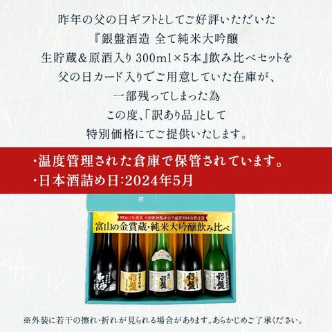 [訳あり] 銀盤酒造 全て純米大吟醸 生貯蔵&原酒入り 300ml×5本[常温]【送料無料】飲み比べセット お酒 日本酒 【7営業日以内に出荷】[月間優良ショップ受賞][JS34]