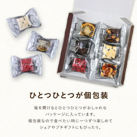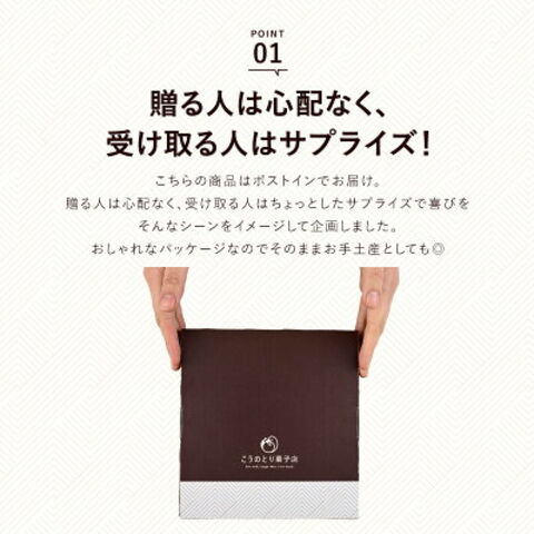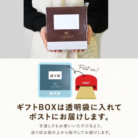 | 【商品名】 ブラウニーポストインギフト6個 【商品紹介】 ポストインだからサプライズで送れるブラウニーギフト 離れたあの人に、御礼やプレゼントにちょっとしたものを送りたいけど、受け取りしてもらわないと、再配達になったら申し訳ないなぁと心配になることはありませんか? こちらの商品はポストインでお届け。贈る人は心配なく、受け取る人はちょっとしたサプライズで喜びをそんなシーンをイメージして企画しました。おしゃれなパッケージなのでそのままお手土産としても◎ こうのとり菓子店オリジナル5種類の見た目も華やかなブラウニー。ひとつひとつがまるでアートのような贈り物にぴったりの美しさです。 チョコレート生地はトッピングとの相性を考え、甘すぎないけど濃厚でしっとりした仕上がりに。ブラウニーの美味しさを引き立てるトッピングにもこだわりました! 味にもこだわった濃厚チョコレートの本格派ブラウニーを是非お召し上がりください!! 《こだわりの6種フレーバー》 ・マシュマロ ふわふわマシュマロをふんだんにトッピング!焼き色が丁度よくもっちり食感です。小ぶりだけど食べ応えがあります。 ・ネーブルオレンジ×ココナッツ チョコ×オレンジの王道の組み合わせ!酸味のあるオレンジのコンポートを濃厚チョコ生地にトッピング。想像通りの美味しさです。食感のアクセントにココナッツをトッピングしました。 ・ラズベリークランチ 赤色が鮮やかなラズベリークランチをトッピング。濃い茶色のチョコ生地と、赤色のコントラストが見た目にも楽しいブラウニーです。 ・バナナ×パイン×アーモンド バナナの甘み、パインの酸味、アーモンドの食感、それぞれの個性が相性抜群のフレーバー。食べるごとに味・食感が違いが楽しめます。 ・ココアビスケット 濃厚チョコとココアビスケットを合わせることでビスケットはしっとり食感に。チョコの甘さが中和されて、より甘さ控えめの味わいに。 ・ヘーゼルナッツ×クランベリー×アプリコット×ピスタチオ4種のナッツとドライフルーツを食べやすい大きさにカットしトッピングしました。カットが小さめなので、一口でそれぞれの味・食感が味わえます。 【原材料】 ■マシュマロ:マシュマロ(コーンシラップ、砂糖、コーンスターチ、ゼラチン)(アメリカ製造)、マーガリン、砂糖、液卵、チョコレート、小麦粉、ココアパウダー、チョコクランチ、ココアビスケット、食塩/トレハロース、乳化剤、膨張剤、着色料(カラメル、カロチン)、香料、酸化防止剤(V.E)、(一部に小麦・卵・乳成分・ゼラチン・大豆を含む)■ネーブルオレンジ×ココナッツ:マーガリン(国内製造)、ネーブルスライスシラップ漬け(ネーブルオレンジ、砂糖、還元水飴)、砂糖、液卵、チョコレート、小麦粉、ココアパウダー、チョコクランチ、乾燥ココナッツ、食塩/トレハロース、乳化剤、膨張剤、着色料(カラメル、カロチン)、酸味料、酸化防止剤(V.C、V.E)、香料、漂白剤(亜硫酸Na)、(一部に小麦・卵・乳成分・大豆・オレンジ含む)■ラズベリークランチ:マーガリン(国内製造)、砂糖、液卵、チョコレート、小麦粉、クランブル(小麦粉、粉糖、マーガリン、その他)、ココアパウダー、チョコクランチ、食塩/トレハロース、乳化剤、膨張剤、着色料(カラメル、赤102、カロチン)、香料、酸化防止剤(V.E)、(一部に小麦・卵・乳成分・大豆・アーモンドを含む)■バナナ×パイン×アーモンド:マーガリン(国内製造)、砂糖、チョコレート、液卵、小麦粉、乾燥果実(パイナップル、砂糖)、乾燥果実(バナナ、ココナッツオイル、砂糖)、ココアパウダー、チョコクランチ、アーモンド、食塩/トレハロース、乳化剤、膨張剤、酸味料、着色料(カラメル、カロチン)、酸化防止剤(亜硫酸Na、V.E)、香料、(一部に小麦・卵・乳成分・大豆・バナナ・アーモンド含む)■ココアビスケット :マーガリン(国内製造)、砂糖、液卵、チョコレート、ココアビスケット(小麦粉、砂糖、ショートニング、その他)、小麦粉、ココアパウダー、チョコクランチ、食塩/トレハロース、膨張剤、乳化剤、着色料(カラメル、カロチン)、香料、酸化防止剤(V.E)、(一部に小麦・卵・乳成分・大豆を含む)■ヘーゼルナッツ×クランベリー×アプリコット×ピスタチオ:マーガリン(国内製造)、砂糖、液卵、チョコレート、乾燥果実(アプリコット、クランベリー、砂糖、植物油脂)、小麦粉、ココアパウダー、チョコクランチ、ヘーゼルナッツ、ピスタチオ、食塩/トレハロース、乳化剤、膨張剤、着色料(カラメル、カロチン)、漂白剤(亜硫酸Na)、香料、酸化防止剤(V.E)、(一部に小麦・卵・乳成分・大豆・アーモンド含む) 【内容量】 マシュマロ…1個 ネーブルオレンジ×ココナッツ…1個 ラズベリークランチ…1個 バナナ×パイン×アーモンド…1個 ココアビスケット…1個 ヘーゼルナッツ×クランベリー×アプリコット×ピスタチオ…1個 【賞味期限】 お届け後30日以上 【保存方法】 直射日光を避けて28℃以下の涼しい