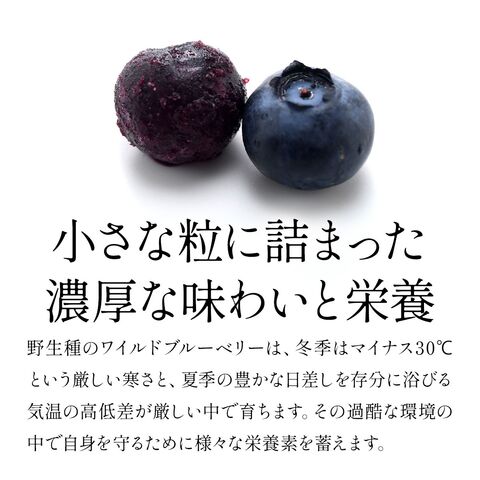 | 小さな粒に詰まった 濃厚な味わいと栄養 野生種のワイルドブルーベリーは、冬季はマイナス30℃という厳しい寒さと、夏季の豊かな日差しを存分に浴びる気温の高低差が厳しい中で育ちます。その過酷な環境の中で自身を守るために様々な栄養素を蓄えます。豊富な栄養素の中でも特に注目すべきは、「アントシアニン」という鮮やかな色素を持つポリフェノール。一般のブルーベリーに比べて野生のワイルドブルーベリーに含まれるアントシアニンは約40%も多いため、こんなに濃い色になるのです。また、「食物繊維」も特筆すべきポイント!以上のことから栄養価も高く、毎日継続して食べたいフルーツとして話題になっているのです! |