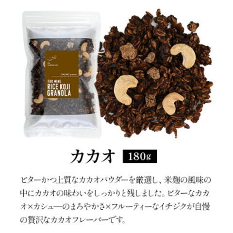 | 名称 選べる 米麹グラノーラ 180g 商品詳細 やさしい甘さ広がる、添加物不使用の米麹グラノーラ! 米麹のやさしい甘み、果実や素材の自然な香り。食べる時間が楽しくなる、そして安心できる、そんな“わたし時間と家族時間の間”に寄り添ってくれるグラノーラです。 ●グラノーラ専門店“MY BEST GRANOLA”監修! 2013年の創業以来、プロスポーツ選手のマネージメントをしていた創業者が「カラダの為に本当に摂りたいものを美味しく。」という想いを実現するために本格派グラノーラを作り続けてきたブランドです。そんな美味しさにこだわり続けるブランドとFor Mine Shopが共同開発したのが、この米麹グラノーラ!米麹をブレンドすることにより、自然でやさしい甘みを実現するだけでなく、より美味しく、より健康的なグラノーラが生まれました。 ●砂糖不使用!なのにこの甘さ…?驚くべき米麹の“発酵の力” 健康や美容を気にする方から注目されている、伝統的な発酵食品「米麹」。FOR MINE shopの米麹グラノーラは、お米と、この米麹を濃縮して作られた“あまざけソース”を使用し、自然な甘さを極限まで引き出しました。砂糖は一切不使用(※1)。それでも「本当に甘い」と感じられるのは、発酵の力で引き出された米麹本来の甘みだから。さらに、甘さをしっかり感じながら、カロリーは一般的な1食分の食事に比べて控えめ!※1) 米麹由来のあまざけソースで甘み付けをしています。 また、米麹は血糖値の上昇がゆるやかな“低GI食品”としても知られ、罪悪感なく楽しめるのもうれしいポイント。何度も試作を重ね、たどり着いたベストな配合で仕上げた甘さは、朝ごはんやおやつにぴったりです。 ●米麹由来の自然な甘さ×オーツ麦の食物繊維で心地よい毎日のリズム作りに! お米と米麹をたっぷりと濃縮したあまざけソースには、「飲む点滴」とも言われるほど栄養素が豊富に含まれています。またグラノーラのベースとなるオーツ麦は、食物繊維が豊富で、その量はなんと玄米の約3倍!米麹濃縮あまざけソースと、食物繊維が豊富なオーツ麦との組み合わせで、スッキリとした毎日を後押し。健やかなリズムを整えたい方にやさしく寄り添う組み合わせです。 ●子どもから大人まで、身体に寄り添う添加物不使用グラノーラ! 市販のグラノーラは添加物がたくさん…という悩みを解決するため、香料・調味料・着色料・保存料・砂糖などの添加物は一切使用していません。健康に気を遣うアナタに食べていただきたいから、素材選びからこだわり、素材の持つ自然なおいしさを、まっすぐに届けます。 原材料名 【プレーン】 有機全粒粉オーツ麦フレーク(アメリカ製造)、濃縮あまざけ(米、米麹、食塩)、グレープシードオイル、米麹糖(米麹)、塩(フランス製造海塩) 【フルーツ】 有機全粒粉オーツ麦フレーク(アメリカ製造)、濃縮あまざけ(米、米麹、食塩)、グレープシードオイル、ドライデーツ、ドライマスカットレーズン、ドライグリーンレーズン、有機ひまわりの種、米麹糖(米麹)、塩(フランス製造海塩) 【ナッツ】 有機全粒粉オーツ麦フレーク(アメリカ製造)、濃縮あまざけ(米、米麹、食塩)、グレープシードオイル、カシューナッツ、ピーカンナッツ、アーモンド、米麹糖(米麹)、塩(フランス製造海塩) 【カカオ】 有機全粒粉オーツ麦フレーク(アメリカ製造)、濃縮あまざけ(米、米麹、食塩)、カシューナッツ、グレープシードオイル、カカオパウダー、ドライいちじく、米麹糖(米麹)、塩(フランス製造海塩) 【黒ごまきなこ】 有機全粒粉オーツ麦フレーク(アメリカ製造)、濃縮あまざけ(米、米麹、食塩)、くるみ、ドライデーツ、グレープシードオイル、きな粉調製品(大豆、ごま)、有機かぼちゃの種、米麹糖(米麹)、塩(フランス製造海塩) 内容量 180g 賞味期限 フルーツ:2026年4月20日 黒ごまきなこ:2026年4月30日 その他:お届け後30日以上 保存方法 直射日光・高温多湿を避けて、冷暗所にて保存してください。 原産国名 日本 販売者 阪神酒販株式会社 兵庫県神戸市兵庫区吉田町2-13-6 |