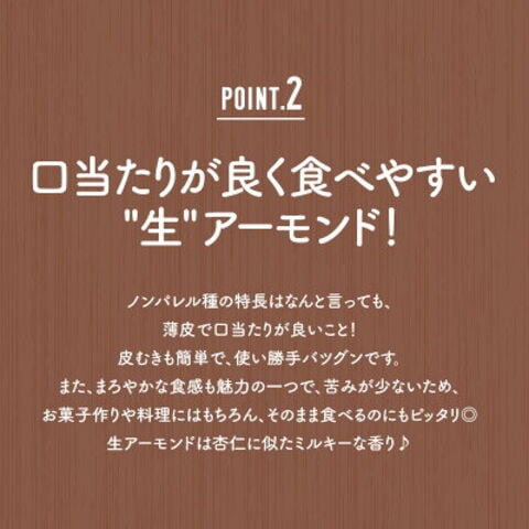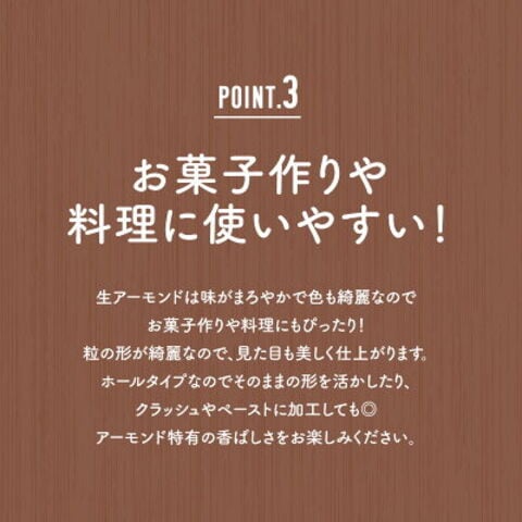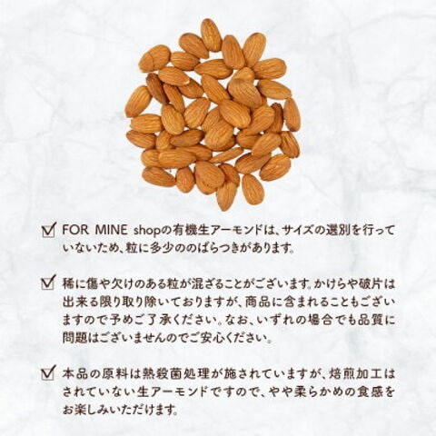 名称 有機生アーモンド150g 商品詳細 カラダがよろこぶ オーガニックの琥珀色の恵み FOR MINE shopの有機生アーモンド ここに注目! POINT.1 人気の高い品種 “ノンパレル種” アーモンドの品種の一つで、世界的に最も人気の高い種類と言われています。特にアメリカはカリフォルニア州で広く栽培されており、流通量が非常に多いのがこのノンパレル種なんです。 POINT.2 口当たりが良く食べやすい“生”アーモンド! ノンパレル種の特長はなんと言っても、薄皮で口当たりが良いこと!皮むきも簡単で、使い勝手バツグンです。 また、まろやかな食感も魅力の一つで、苦みが少ないため、お菓子作りや料理にはもちろん、そのまま食べるのにもピッタリ◎生アーモンドは杏仁に似たミルキーな香り♪ POINT.3 お菓子作りや料理に使いやすい! ・マカロン ノンパレルの薄皮をブランチング(表皮をむく処理)をして粉砕するとアーモンドプードルにぴったり。味がまろやかで色も綺麗! ・フロランタン 粒の形が綺麗なので、見た目も華やかに◎ローストしてキャラメルと合わせると香ばしさアップ! ・バターチキンカレー 皮をむいてペースト状にすると、コクととろみ付けにぴったり! ・白身魚の衣がけ(アーモンドクラスト) 粉砕して衣として使うのも上級テクニック!アーモンド特有の香ばしさとカリッとした食感に◎ ●FOR MINE shopの有機生アーモンドは、サイズの選別を行っていないため、粒に多少ののばらつきがあります。 ●稀に傷や欠けのある粒が混ざることがございます。かけらや破片は出来る限り取り除いておりますが、商品に含まれることもございますので予めご了承ください。なお、いずれの場合でも品質に問題はございませんのでご安心ください。 ●本品の原料は熱殺菌処理が施されていますが、焙煎加工はされていない生アーモンドですので、やや柔らかめの食感をお楽しみいただけます。 原材料名 有機アーモンド 内容量 150g 賞味期限 お届け後30日以上 保存方法 直射日光・高温多湿を避け、冷暗所で保管 原産国 アメリカ 販売者 阪神酒販株式会社 兵庫県神戸市兵庫区吉田町2-13-6 |