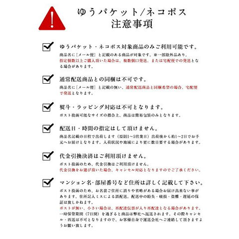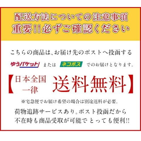 | 【お届けについて】 ★1〜2袋購入(メール便) メール便・全国送料無料(北海道・沖縄・離島含む) ※出荷後に1〜2日程度、到着までお時間がかかります。 ※ポストや新聞受けへの投函になります。(手渡しではございません。) ★3袋以上購入(宅配便) 送料無料(北海道・沖縄・離島は別途料金) ※北海道 別途350円 沖縄 別途3200円 離島は地域により実費精算となります。 追加で発生する送料はご注文後メールでご案内いたします。 ※商品名に[メール便]と記載の無い通常商品との同梱不可。同梱の場合は宅配便での配送となります。 ※こちらの商品は、出荷日・着日の指定をお受けしておりません。発送時に、発送のご連絡をさせていただきます。 ※のし、包装などの対応は、受けしておりません。 |