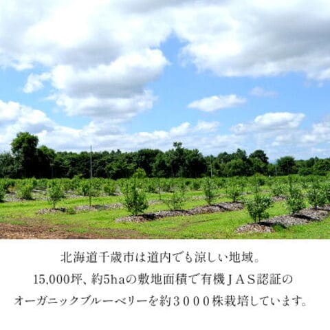 北海道千歳市は道内でも涼しい地域。15,000坪、約5haの敷地面積で有機JAS認証のオーガニックブルーベリーを約3000株栽培しています。