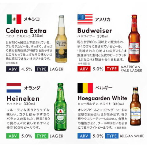 | 名称 世界12か国12本のビールセット 商品詳細 メキシコ、アメリカ、ベルギー、ドイツなど、世界12ヵ国から人気の12本を厳選しました! 家のみでも、友人とのパーティーでも大活躍!世界旅行の気分を味わうことが出来ます♪ 国ごとに香りも、苦味も、飲みごたえも違う!コロナの爽やかさ、ギネスのコク、ヒューガルデンのフルーティーさ…世界の味覚をそのまま瓶に詰め込みました。過去の旅行を思い出したり次はこの国に行きたい…などワクワクしながら飲み比べができます! <商品ラインナップ> ■Colona Extra(コロナ エキストラ)330ml 世界180ヵ国以上で愛されている、プレミアムビール。すっきり、さっぱり飲める爽快感が特徴で、飲みやすさにこだわって仕上げたその味わいは他に真似できないオリジナルです。 ・タイプ:ラガー ・国:メキシコ ※中国製造 ・ABV:4.5% ・原材料:麦芽・ホップ・米・コーン ■Budweiser(バドワイザー) 330ml 現在世界80ヶ国以上で販売され、多くの方々に愛されているビール。“洗練された心地よいのどごし”は厳選された素材と伝統のビーチウッド(ぶなの木)製法から生まれます。 ・タイプ:アメリカンペールラガー ・国:アメリカ ※中国製造 ・ABV:5.0% ・原材料:麦芽、ホップ、米 ■Heineken(ハイネケン) 330ml フルーティな香りとリッチな味わい。コクと飲みやすさのバランスの取れた、世界190カ国の人々に親しまれている麦芽100%ビールです。 ・タイプ:ラガー ・国:オランダ ・ABV:5.0% ・原材料:麦芽(外国製造)、ホップ ■Hoegaarden White(ヒューガルデン ホワイト) 330ml オレンジピールとコリアンダーシードの完璧な組み合わせが生み出す、香り華やぐフルーティーな味わい。食事との相性がよく、フードの味わいを引き立てるホワイトビールです。 ・タイプ:ベルジャンホワイト ・国:ベルギー ※韓国製造 ・ABV:5.0% ・原材料:大麦麦芽・ホップ・小麦・コリアンダーシード・オレンジピール ■Guinenss Original Extra Stout(ギネス オリジナル エクストラ スタウト) 330ml オリジナルのギネスに近い、ローストの香り・キレのある爽やかな苦みを味わいはそのままに、よりフルーツのような風味を楽しめるビール。 ・タイプ:エクストラスタウト ・国:アイルランド ・ABV:5.0% ・原材料:麦芽・ホップ・米・コーン ■Tsingtao Beer(青島ビール) 330ml マイルドな口当たりとスムーズなのどごし、清々しい香りで、中華料理全般によく合います。数々のビールコンテストで金賞を受賞している実力派ビールです。 ・タイプ:アメリカンラガー ・国:中国 ・ABV:4.7% ・原材料:麦芽、ホップ、米 ■Chang Beer(チャーンビール) 320ml フルーツのようなホップのアロマと、心地よく豊かなフレーバーを持ち、東南アジアはもちろん欧米でも愛されるビールです。 ・タイプ:ラガー ・国:タイ ・ABV:5.0% ・原材料:麦芽、ホップ、米 ■Saigon Premium(サイゴンプレミアム) 330ml ベトナム最大のビールメーカーが誇る、さっぱりとした飲み口とすっきりとした味わいが特徴のビールです。 ・タイプ:ピルスナー ・国:ベトナム ・ABV:4.8% ・原材料:麦芽、ホップ、米/香料 ■Bintang(ビンタン) 330ml 淡黄色のすっきりとした味わいで、東南アジア料理はもちろん、どんな料理とも相性が良い、インドネシアで人気No.1のビールです。 ・タイプ:ピルスナー ・国:インドネシア ・ABV:4.7% ・原材料:麦芽、ホップ、米 ■Taiwan Beer(台湾ビール 金牌瓶) 330ml 琥珀色で爽やかな香り、キレの良いすっきりとした味わいが特徴の、台湾の代表的なビールです。 ・タイプ:ペールラガー ・国:台湾 ・ABV:5.0% ・原材料:麦芽、ホップ、蓬莱米 ■Konig Pilsener(ケーニッヒ ピルスナー) 330ml 世界最大のホップ栽培地域のホップと厳選したモルトを使用した、ほろ苦さとほのかな甘みを残す素晴らしくバランスのとれたビール。「ピルスナーの王様」の名にふさわしい仕上がりです。 ・タイプ:ピルスナー ・国:ドイツ ・ABV:4.9% ・原材料:麦芽、ホップ ■Cruzcampo Pilsen (クルスカンポ ピルゼン) 330ml 薄い黄金色が華やかで、口に含むとコーンと麦芽の香ばしさが絶妙に絡み、さっぱりとした味わいの中にもうまみと苦みが広がります。 ・タイプ:ラガー ・国:スペイン ・ABV:4.8% ・原材料:麦芽、コーン、ホップ 内容量 12本 原産国名 オランダ・アイルランド・中国・タイ・ベトナム・インドネシア・台湾・ドイツ・スペイン・韓国 保存方法 要冷蔵 販売者 株式会社ウェルサーブ 大阪府大阪市北区錦町4-82 |