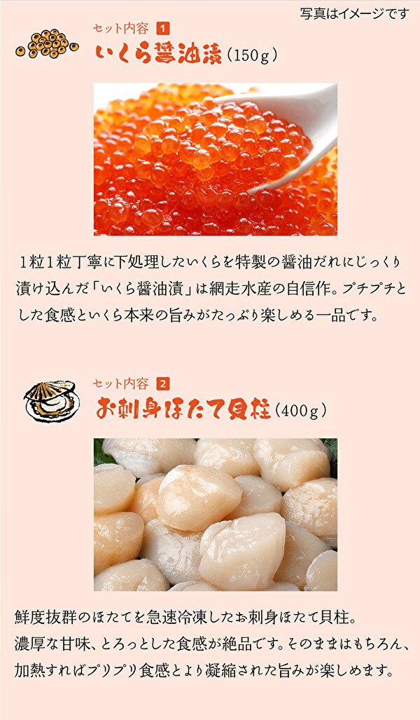 網走水産自慢の「海の宝石」いくら醤油漬と、身の締りが良く凝縮された甘みが人気の「ほたて貝柱」のセットです。