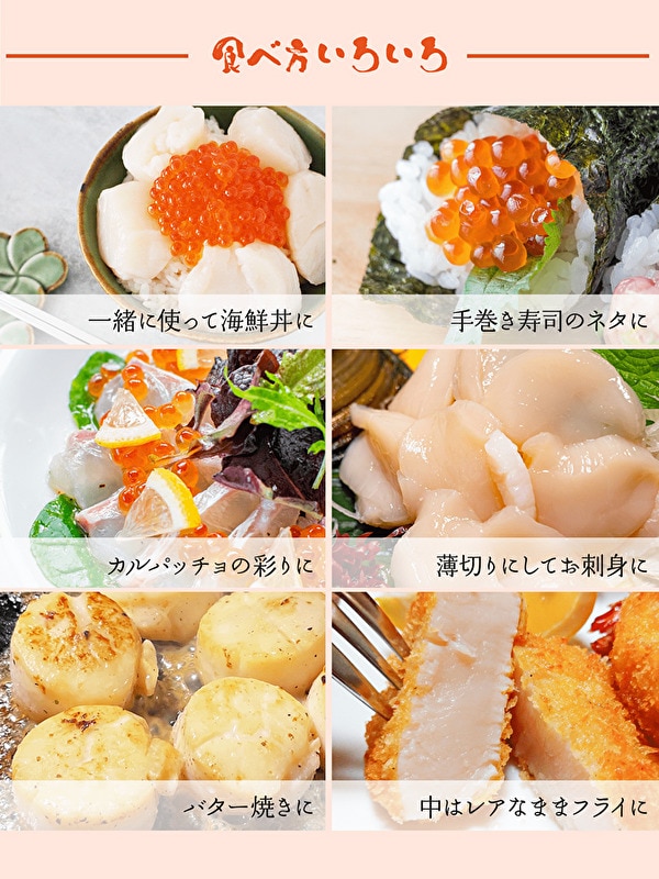北海道産 いくら・ほたてセット[いくら醤油漬(150g)・お刺身ほたて貝柱(400g)] | 獲れたてのホタテを急速冷凍し、鮮度と美味しさを閉じ込めました。
