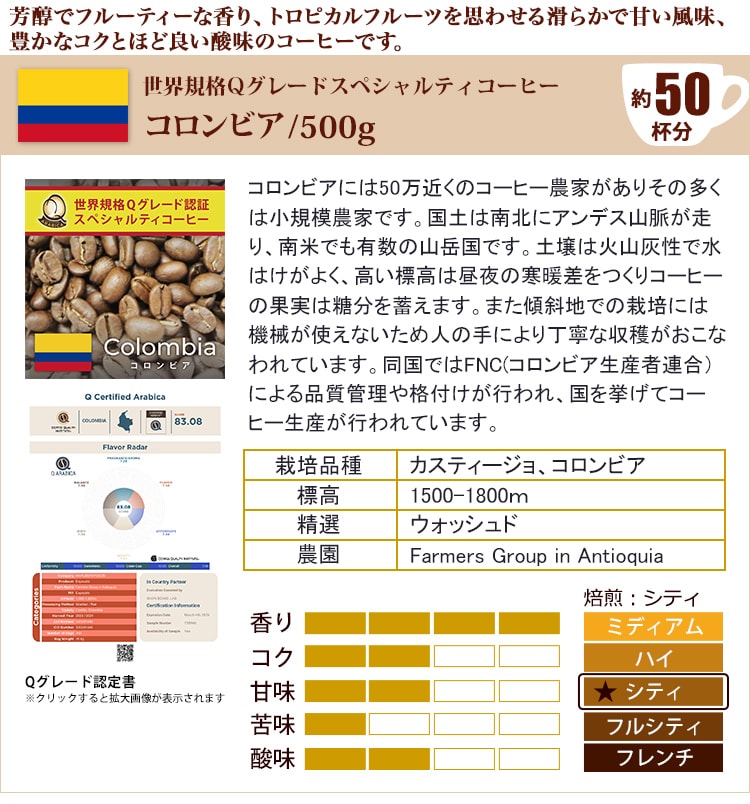■コロンビア世界規格Qグレードスペシャルティ珈琲豆/500g入袋