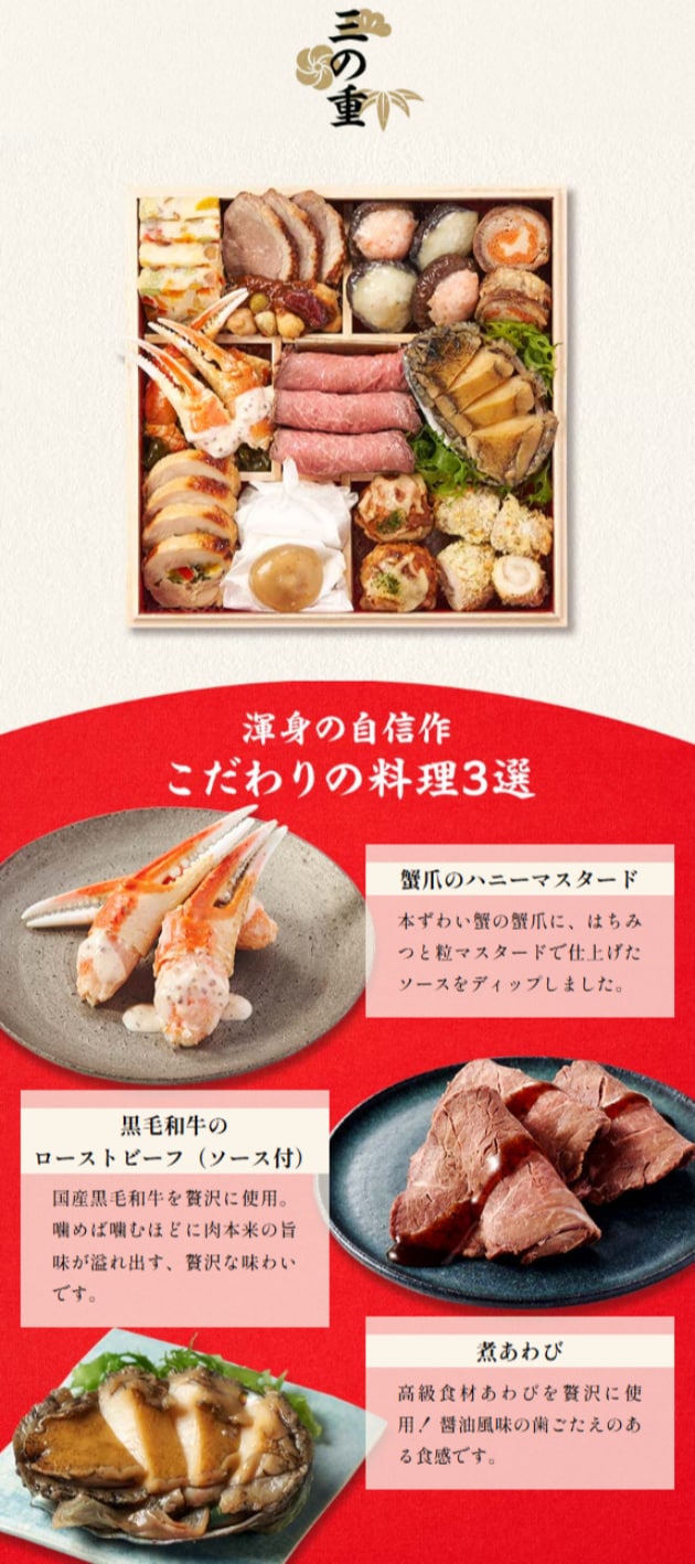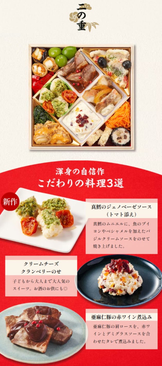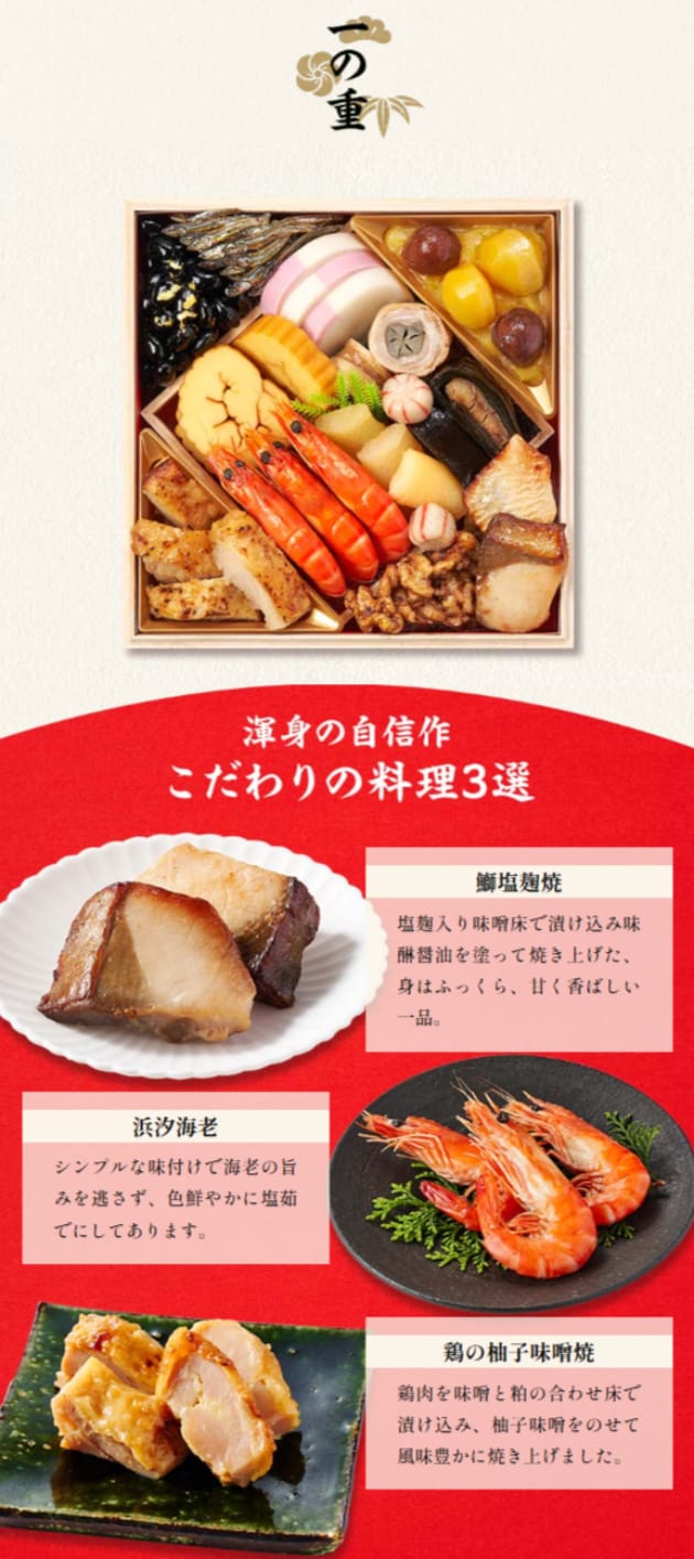 金箔黒豆,田作り,栗きんとん,鰤塩麹焼,かつをくるみ,鶏の柚子味噌焼,市松かまぼこ,豚八幡巻,手まり麩,鰊昆布巻,数の子美味漬,浜汐海老,伊達巻