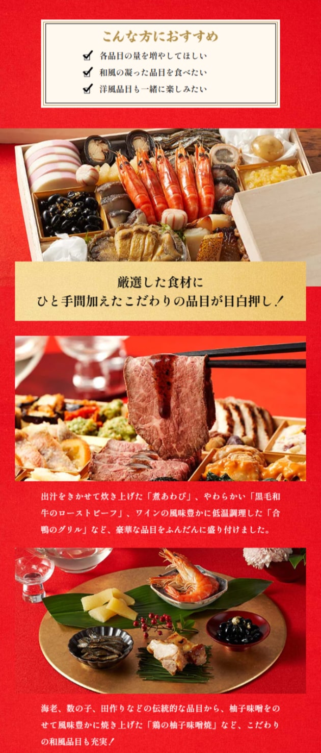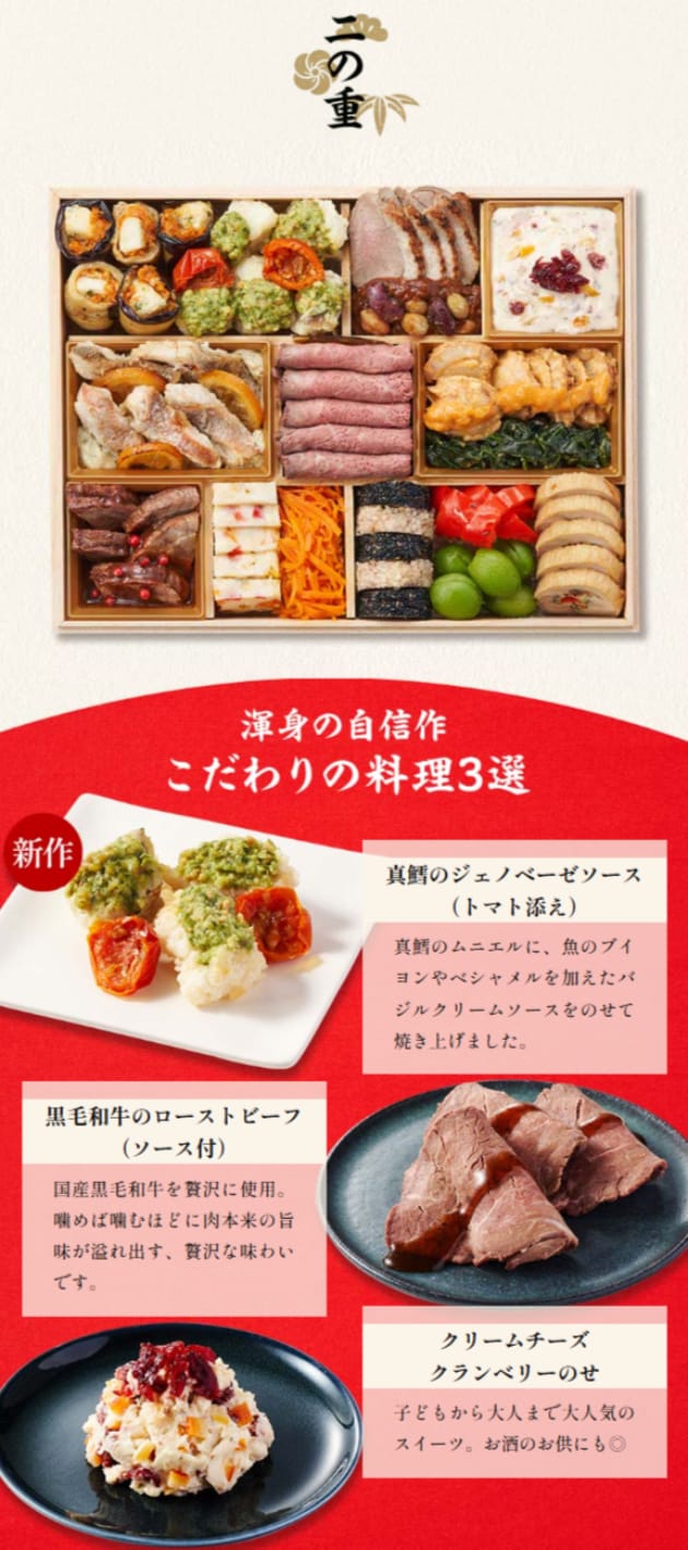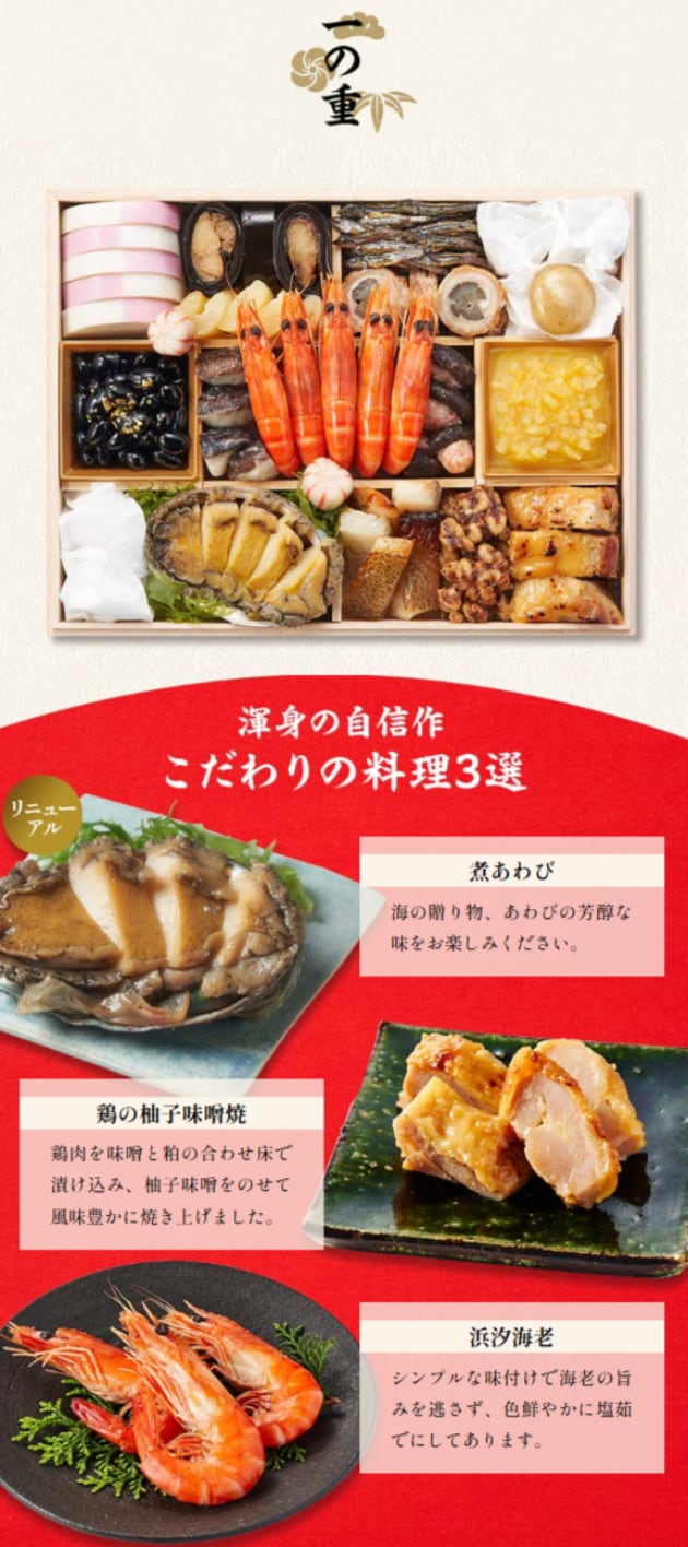 市松かまぼこ, 練昆布巻, 手まり麩, 数の子美味漬, 田作り, 琥珀ふくさ包み, 豚八幡巻, 金箔黒豆, 裏白しいたけ, 浜汐海老, 海老しいたけ, 栗きんとん(刻み栗), 煮あわび, カラスガレイ西京焼, かつをくるみ, 鶏の柚子味噌焼