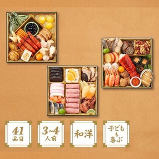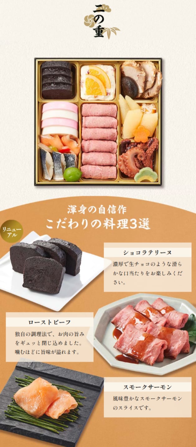 ショコラテリーヌ, 蒲鉾赤, 蒲鉾白, 彩野菜マリネ, スモークサーモン, にしん昆布〆, 若桃甘露煮, クリームチーズとフルーツピールオレンジ添え, ローストビーフ(ローストビーフソース付), チャーシュー, 椎茸煮, 紅白なます, 味付数の子, 梅人参煮, 蛸照り焼き, 松笠甘露煮真鯛の幽庵焼, 鳴門金時芋レモン煮, 若桃甘露煮