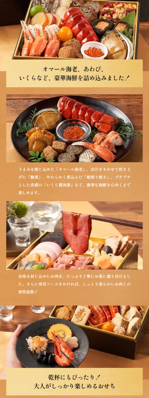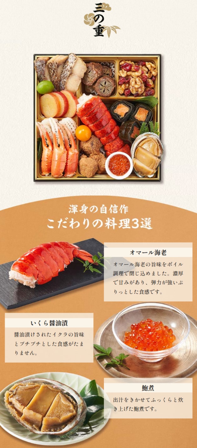 松笠いか白焼き, わかめ, かに爪柚庵焼, 牛肉八幡巻, オマール海老, 魚卵甘露煮, きんかんさわやか煮, いくら醤油漬, 紅鮭昆布巻, 鮑煮, クランベリークルミ