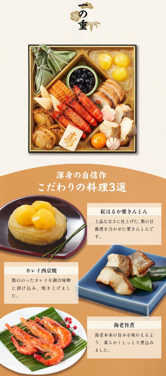 笹餅こしあん, ほたて煮, 寿高野, 伊達巻, 味付焼筍, 黒豆煮, 海老旨煮, 鶏肉三色巻, 梅麩甘露煮, 紅はるか栗きんとん, カレイ西京焼, 手まり麩, きんかんさわやか煮