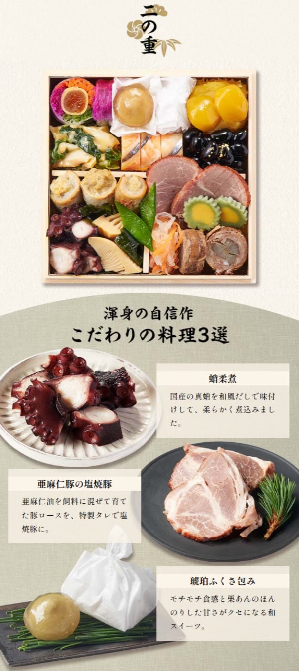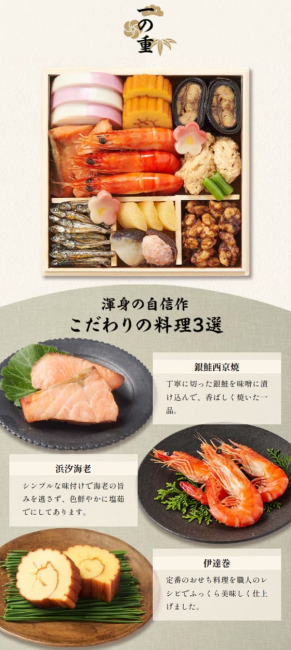 市松かまぼこ, 伊達巻, 練昆布巻, 紅白梅麩, 銀鮭西京焼, 浜汐海老, 鰤の子吉野煮, いんげん, 田作り, 数の子美味漬, 裏白しいたけ, 海老しいたけ, かつをくるみ