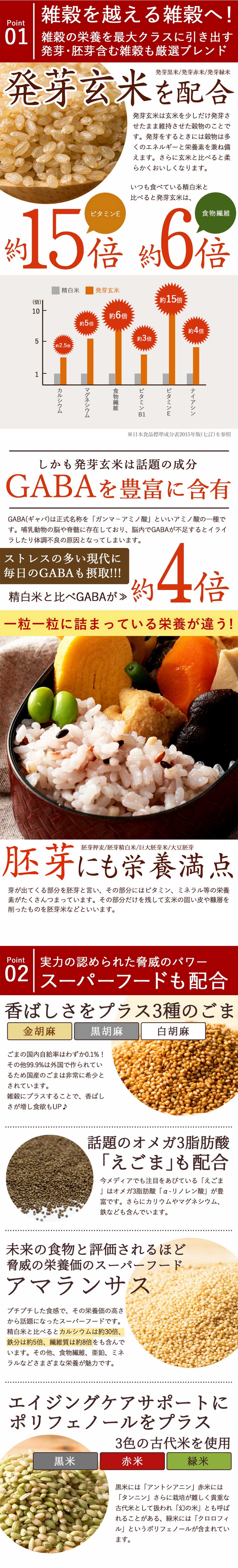 ・原材料/材質/素材:丸麦、黒米、大豆、押麦、もち麦、もち精白米、はだか麦、胚芽押麦、青大豆、米粒麦、若玄米、巨大胚芽米、もち玄米、発芽玄米、赤米、白もち麦、緑米、きび、小豆、焙煎玄米、胚芽精白米、ひえ、はと麦、高きび、とうもろこし、黒大豆、黒焼き玄米、秘伝豆、発芽赤米、発芽緑米、発芽黒米、大豆胚芽、白えごま、黒えごま、アマランサス、あわ、黒胡麻、白胡麻、金胡麻
