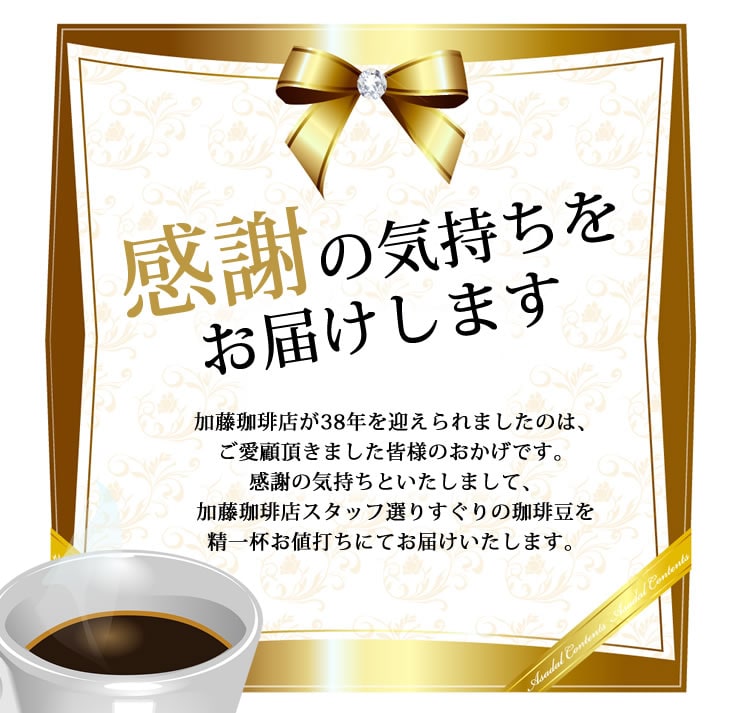 【スタッフ一同大感激!】おかげ様でコーヒー一筋の私ども加藤珈琲店はオープンから38年を迎えることができました。感謝の気持ちを込めたコーヒーセットをご提供させて頂きます。選りすぐりの珈琲豆たっぷり約200杯分入り?