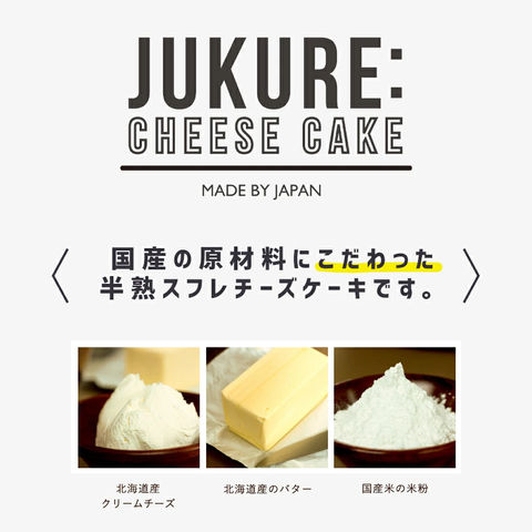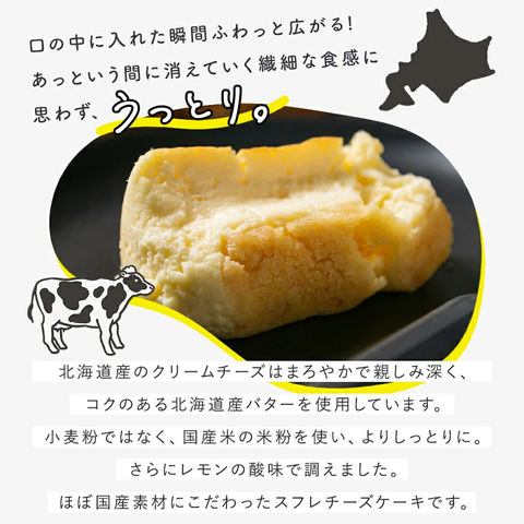 北海道産のクリームチーズはまろやかで親しみ深く、コクのある北海道産のバターを使用しています。 国産米の米粉を使いよりしっとりに。ほぼ国産素材にこだわったスフレチーズケーキとなっております。絶妙な火加減でカスタードはメレンゲが潰れない固さに。レモンの酸味で調えた半熟スフレチーズケーキです。