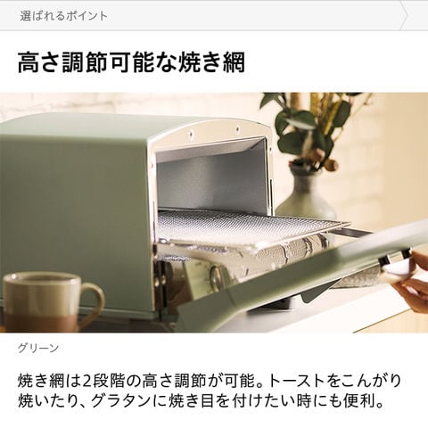 焼き網は2段階の高さ調節が可能。トーストをこんがり焼いたり、グラタンに焼き目を付けたい時にも便利。