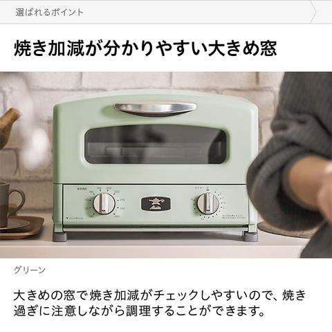 大きめの窓で焼き加減がチェックしやすいので、焼き過ぎに注意しながら調理することができます。