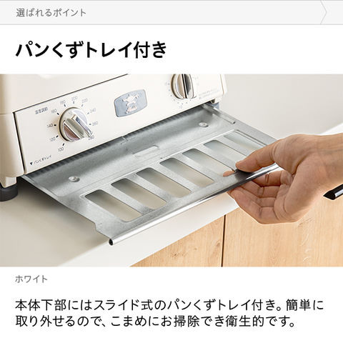 本体下部にはスライド式のパンくずトレイ付き。簡単に取り外せるので、こまめにお掃除でき衛生的です。