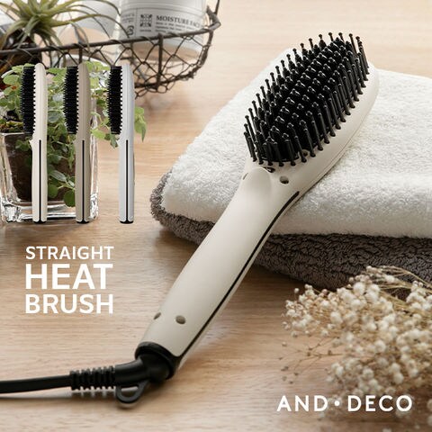 【1年保証】 ヒートブラシ ストレート ヘアアイロン ブラシ マイナスイオン 瞬間120秒 海外対応 専用ポーチ付 ヘアーアイロン 省エネ 46W AND・DECO アンドデコ 【オフホワイト】 小型商品(ヤマト)