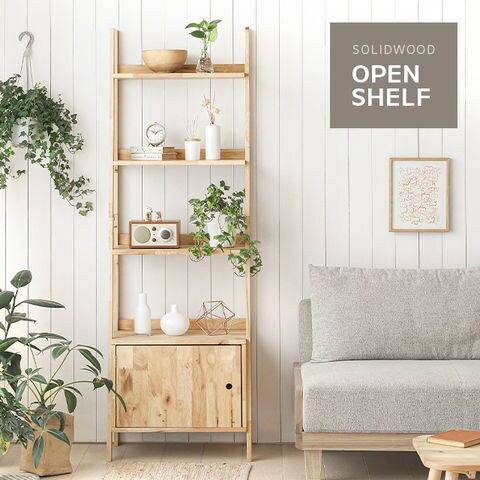ラバーウッド無垢材の優しい風合いを纏った収納付きシェルフ。どんなお部屋にも馴染みやすいナチュラルな雰囲気と、便利なオープン棚と扉付き棚の2種類の収納で自分好みのお部屋を形作ります。